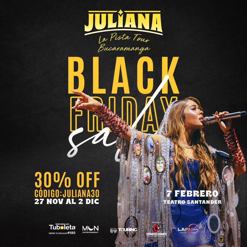 El próximo Sábado 07 de febrero de 2026, la cantante, actriz y compositora Colombiana JULIANA llega a Bucaramanga con LA PISTA TOUR, después del inolvidable sold out en el Movistar Arena de Bogotá, esta nueva parada será una celebración vibrante de su más reciente álbum La Pista, un homenaje sonoro y visual a las fiestas latinoamericanas, donde lo criollo y lo glam se encuentran. Ganadora del Latín Grammy 2021 como Mejor Nuevo Artista y nominada nuevamente en 2024 por su álbum Mar Adentro, JULIANA invita a su público Santandereano a vivir una noche donde la música, el baile y las emociones se funden en un show único, pensado para conectar desde la raíz con su gente. Con un repertorio que incluye canciones de sus cuatro álbumes (Juliana, Dos Dos, Mar Adentro y La Pista), esta será una experiencia llena de energía, brillo, historias y fiesta.